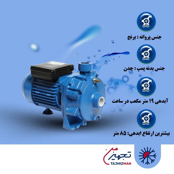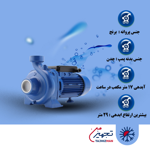 این پمپ با سایز دهانه ورودی  و خروجی 1/2*2 اینچ ، بیشترین فشار یا ارتفاع 13 متر و بیشترین آبدهی یا دبی 57 متر مکعب در ساعت مناسب افزایش فشار آب در آبیاری ، مصارف صنعتی و انتقال سیالات غیر خورنده و مایعات تمیز به شمار می آید.